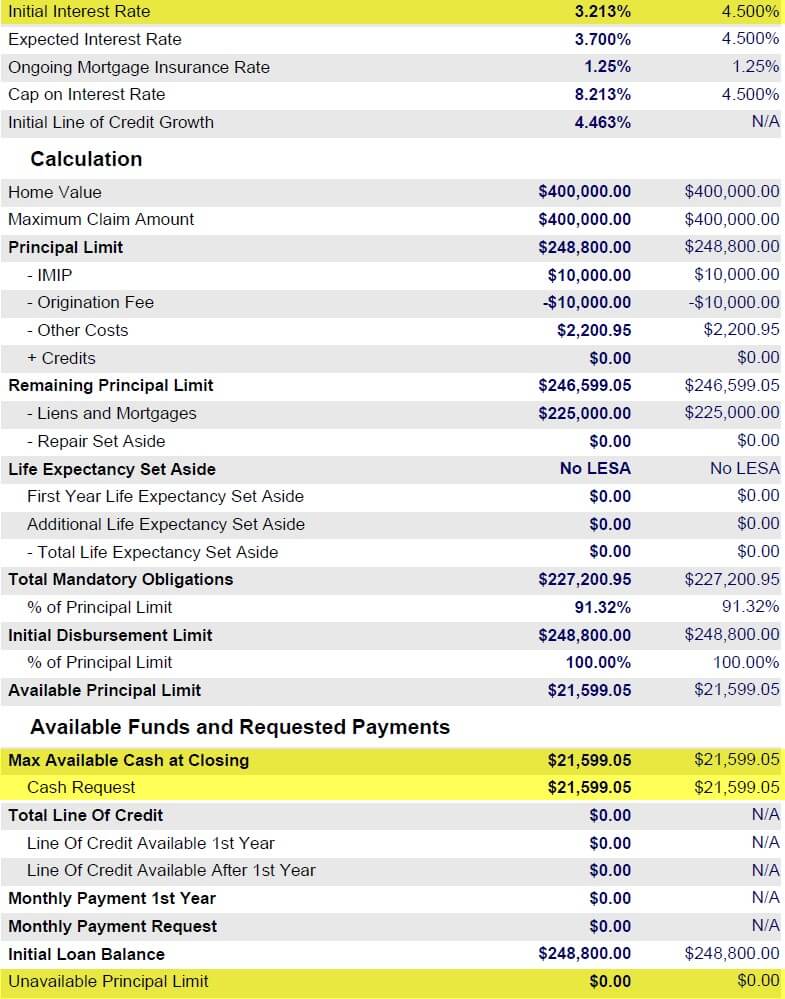 No line of credit is available after the first year since all proceeds are taken upfront. Therefore, there is $99,520 in unused principal limit. The borrower is much better off taking the adjustable rate option when the home is owned free and clear.
