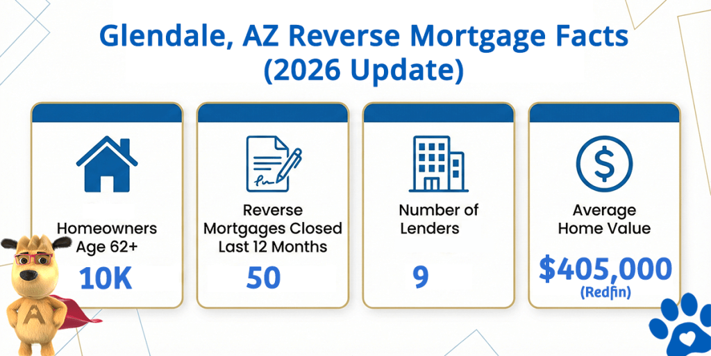With an average home value around $405,000, most Glendale properties fall well below the 2026 FHA HECM lending limit of $1,249,125. That makes the standard HUD-insured reverse mortgage accessible to many eligible homeowners without the need for a jumbo loan.