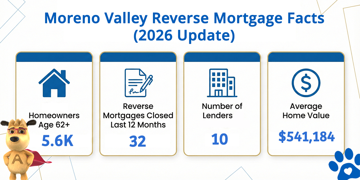 | City | Homeowners Age 62+ | Reverse Mortgages Closed Last 12 Months | Lenders in Moreno Valley (est) | Avg. Home Value |